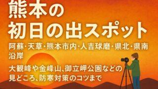 熊本・地域情報 熊本初日の出スポット|大観峰から金峰山までエリア別モデルルートと夜明け時刻の目安ガイド 熊本の初日の出スポットを阿蘇・天草・熊本市内・人吉球磨・県北・県南沿岸の6エリアで整理。大観峰や金峰山、御立岬公園などの見どころ、アクセスや駐車場、混雑回避の目安、撮影と防寒のコツまでわかりやすく案内します。 2025.09.13 熊本・地域情報
