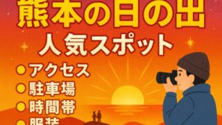 熊本・地域情報 熊本の日の出スポットガイド|地元民がすすめる海と外輪山の朝焼け名所解説 阿蘇・天草・熊本市内など熊本の人気日の出スポットを、アクセスや駐車、ベスト時間、天気の見方と合わせて紹介。初日の出や家族・写真向けの選び方、混雑回避や防寒のポイントもわかります。 2025.09.12 熊本・地域情報