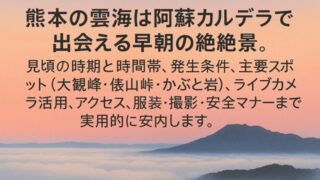 熊本・観光情報 熊本雲海|阿蘇大観峰の見頃時期と発生条件・夜明け前からの観賞ポイントを地元民がガイド 熊本の雲海は阿蘇カルデラで出会える早朝の絶景。見頃の時期と時間帯、発生条件、主要スポット(大観峰・俵山峠・かぶと岩)、ライブカメラ活用、アクセス、服装・撮影・安全マナーまで実用的に案内します。 2025.09.14 熊本・観光情報